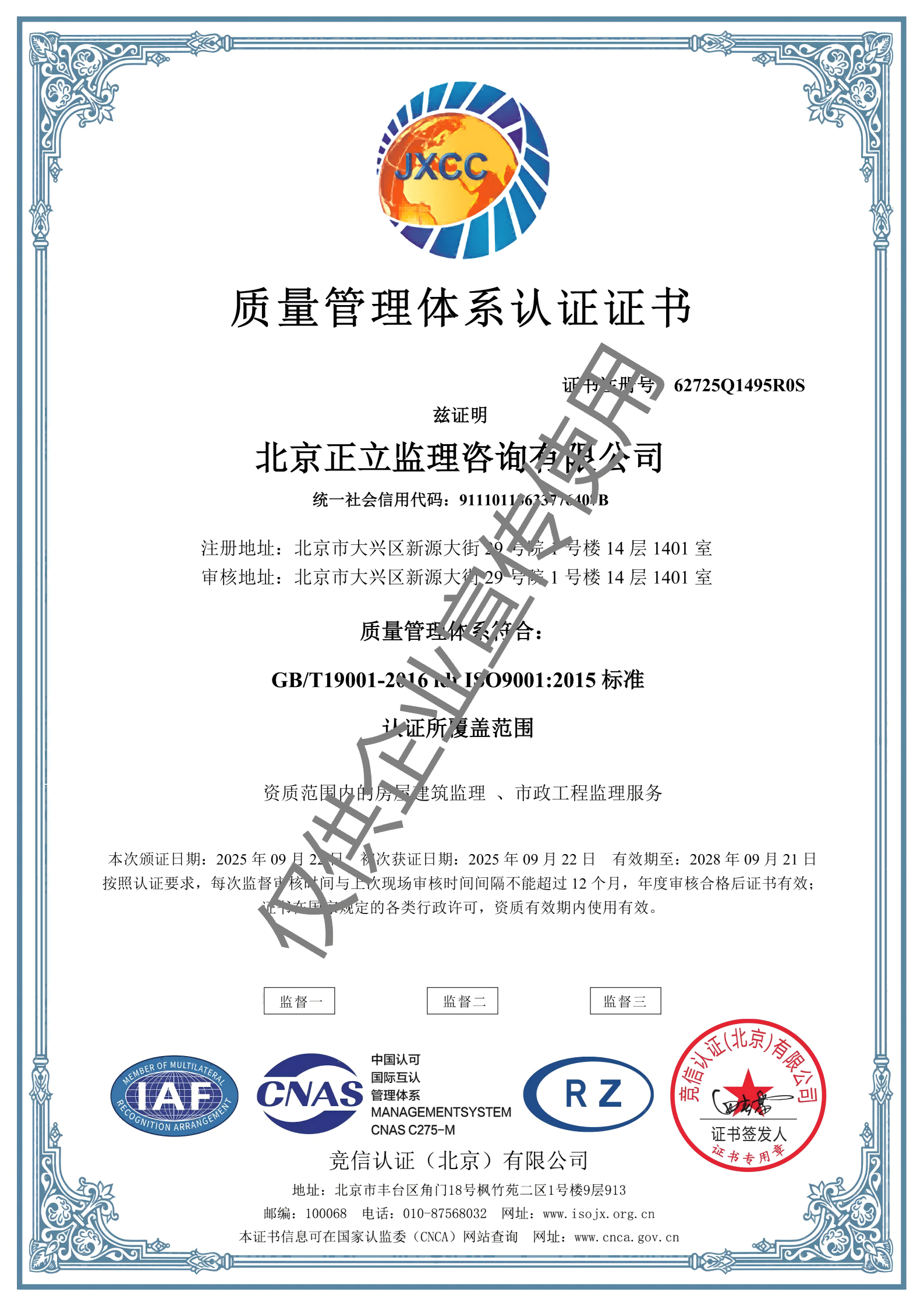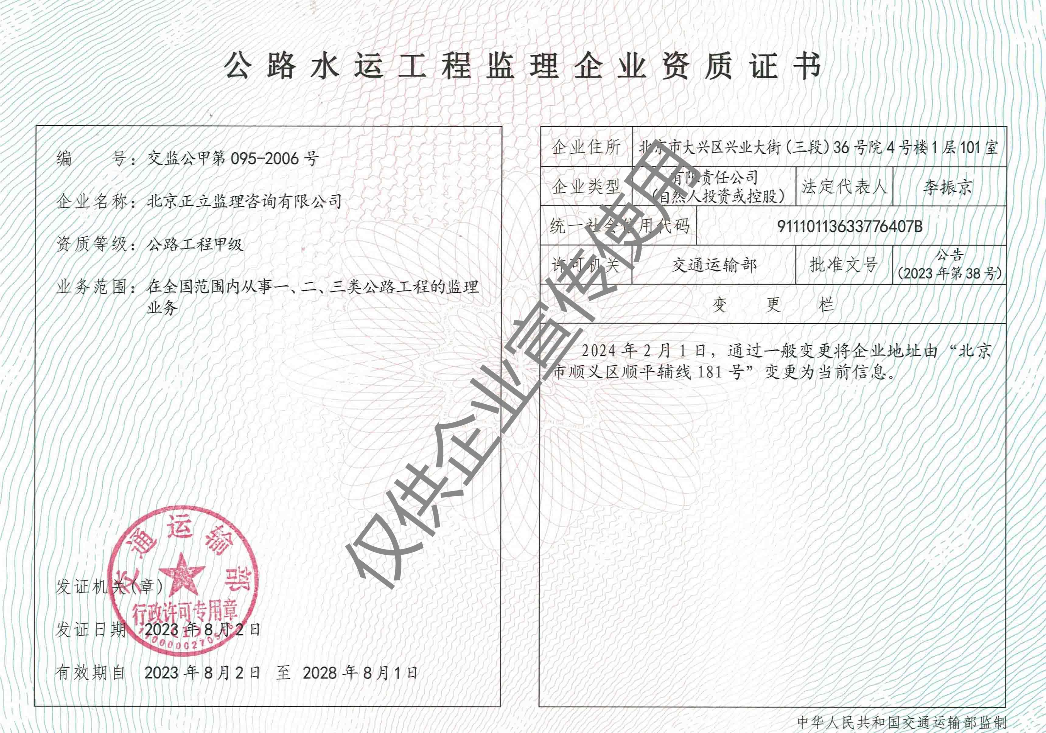 北京正立監(jiān)理咨詢有限公司成立于1998年7月1日,其前身隸屬于北京市公路質(zhì)量監(jiān)理站。具有獨立法人資格,是獨立核算、自負盈虧的經(jīng)濟實體。企業(yè)經(jīng)營范圍:公路工程監(jiān)理、交通工程監(jiān)理、市政公用工程建設(shè)監(jiān)理、工業(yè)與民用建筑工程監(jiān)理、工程監(jiān)理咨詢、技術(shù)咨詢、技術(shù)培訓(xùn)等。